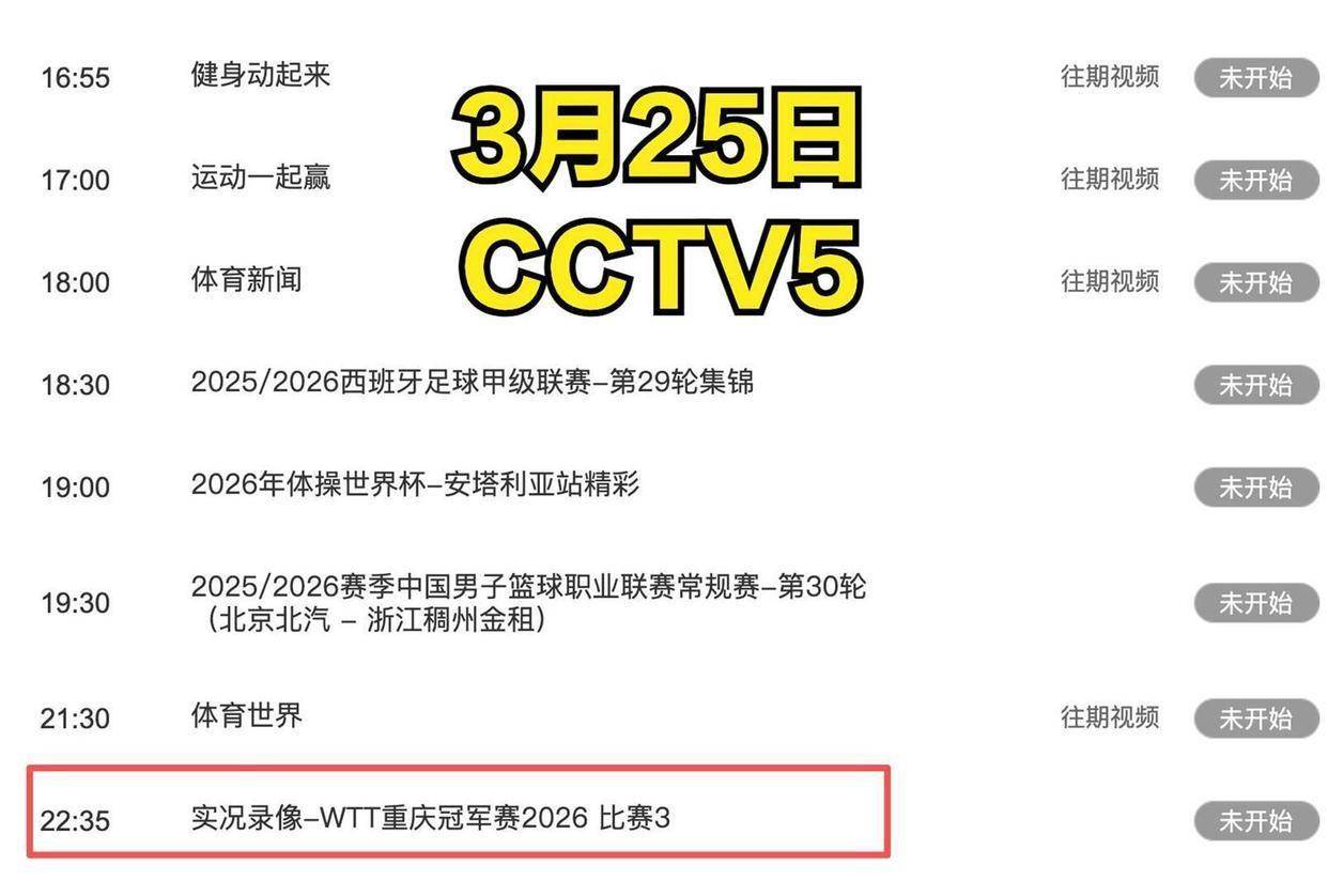 中央电视台体育频道将对本次赛事进行全程直播。 根据安排,3月25日晚上22点35分,CCTV5将回放WTT重庆冠军赛的比赛,供球迷回顾国乒近期的状态。 而从3月30日开始,央视体育频道将直播澳门世界杯的实况。 球迷可以通过CCTV5、CCTV5+以及央视频等平台收看比赛。 具体的直播时间将紧密跟随赛程,从每天上午的小组赛开始,到晚间时段的淘汰赛,直至4月5日晚间的男女单打决赛。