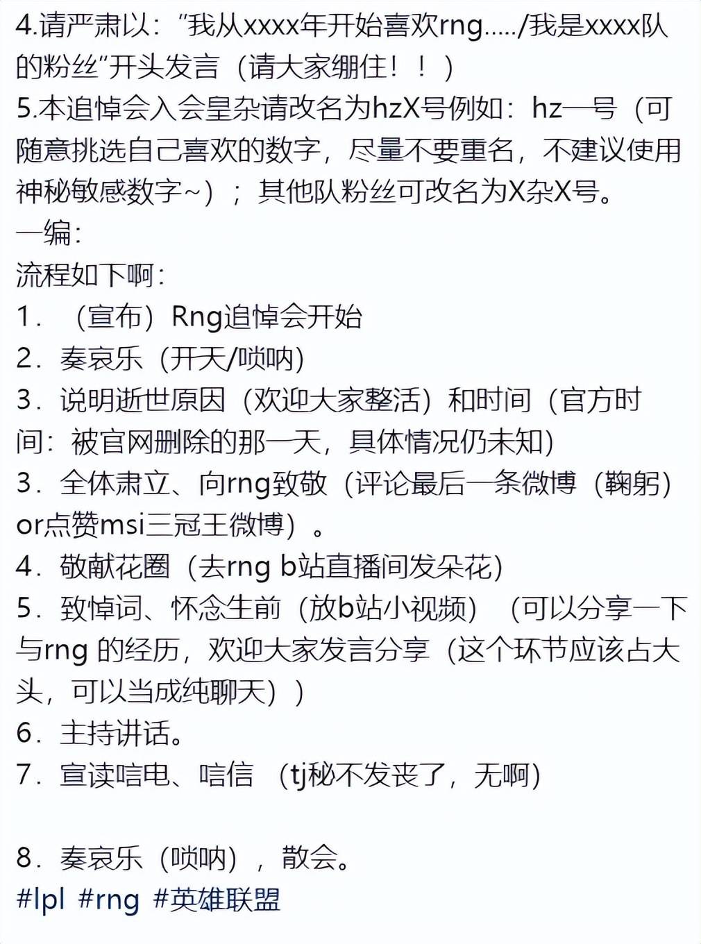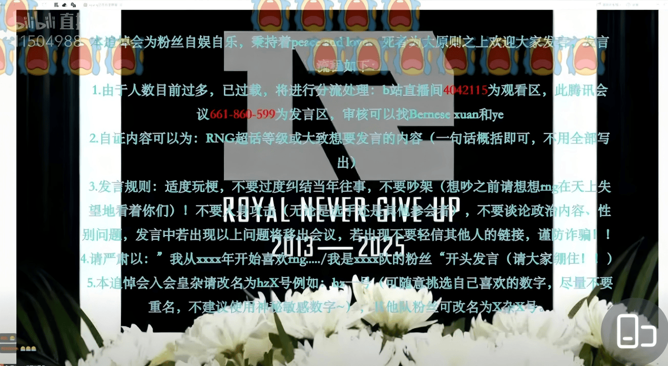 随着大量网友的出谋划策,这场“赛博追悼会”不仅有了实况转播,甚至还有了参会要求,即,需要到场发言的粉丝出示“RNG超话等级或大致想要发言的内容”;发言内容以“我从xxxx年开始喜欢rng...../我是xxxx队的粉丝”作为开头格式。