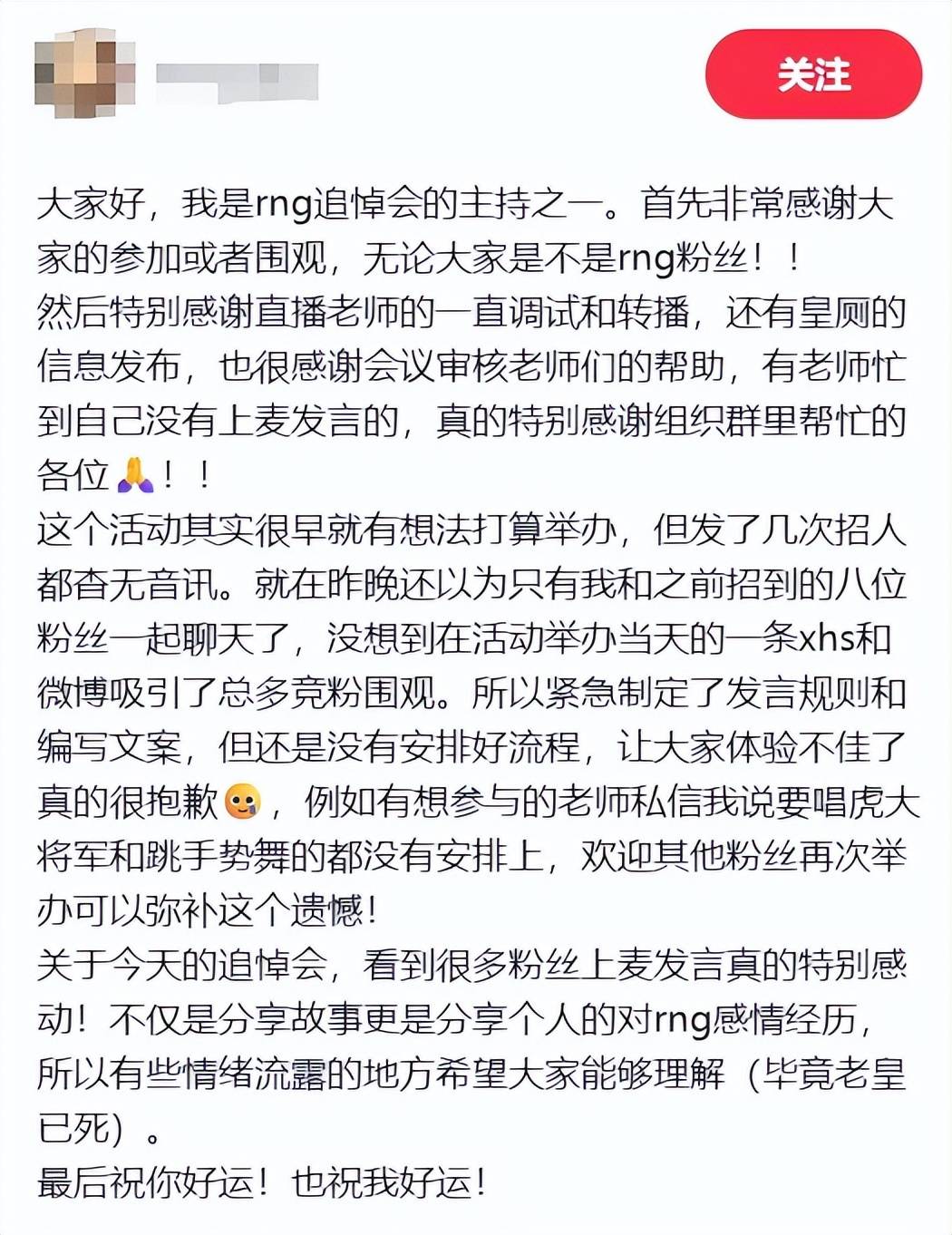 据悉,有关RNG追悼会的举办,是由某红书用户“mingggg”发起,原计划在1月9日晚上八点半在腾讯会议拉个聊天群,大家共同缅怀一波曾经的LPL豪门。